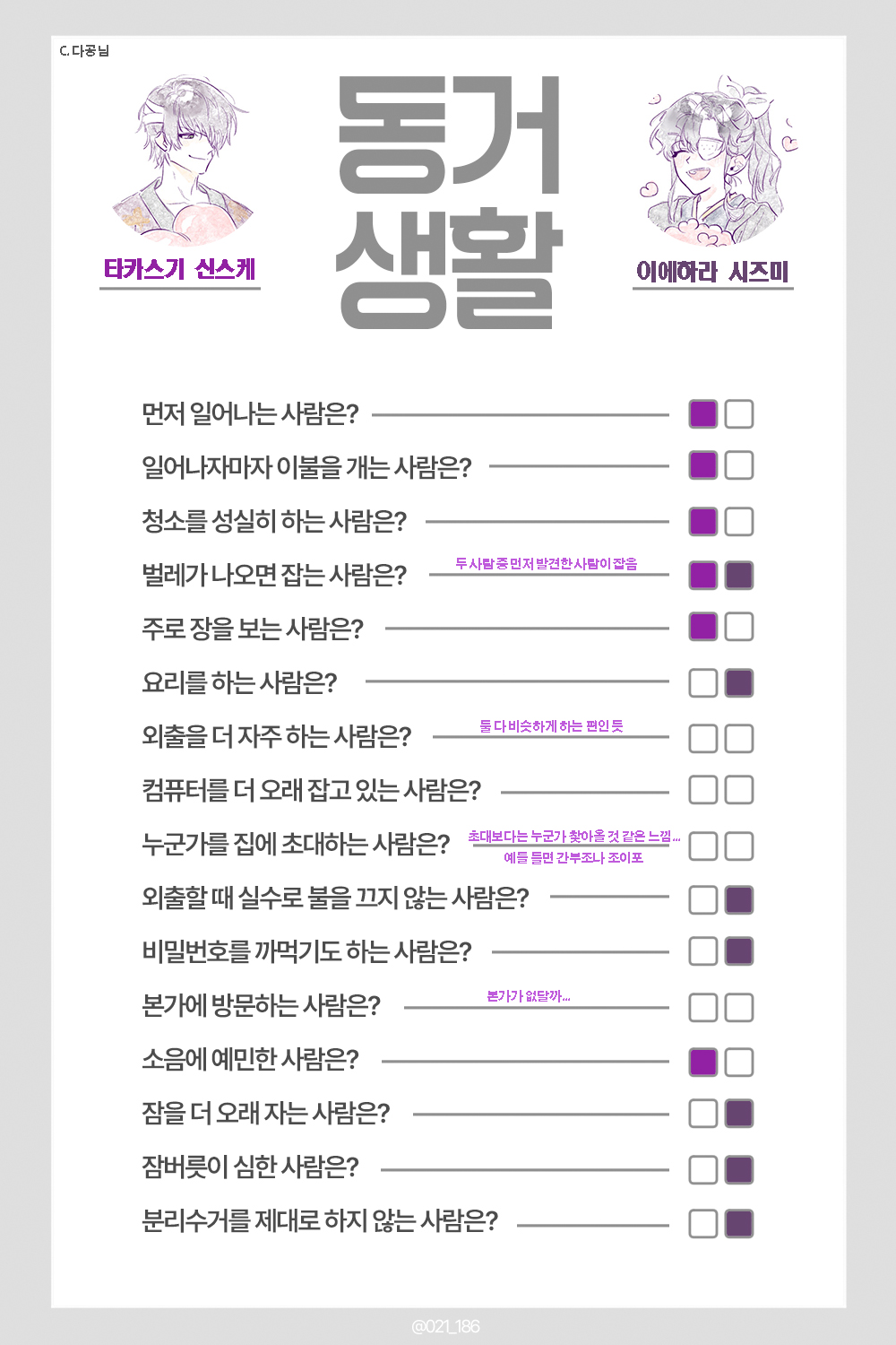 이에하라와 타카스기가 동거를 하게 된다면 우당탕한 일상이지 않을까 싶어요. 아침잠이 많은 이에하라를 항상 잔소리로 깨우는 타카스기. 둘이 외출을 했는데 불을 안 끄고 나왔다며 소리 지르는 이에하라 때문에 다시 집으로 돌아가는 타카스기와 이에하라.