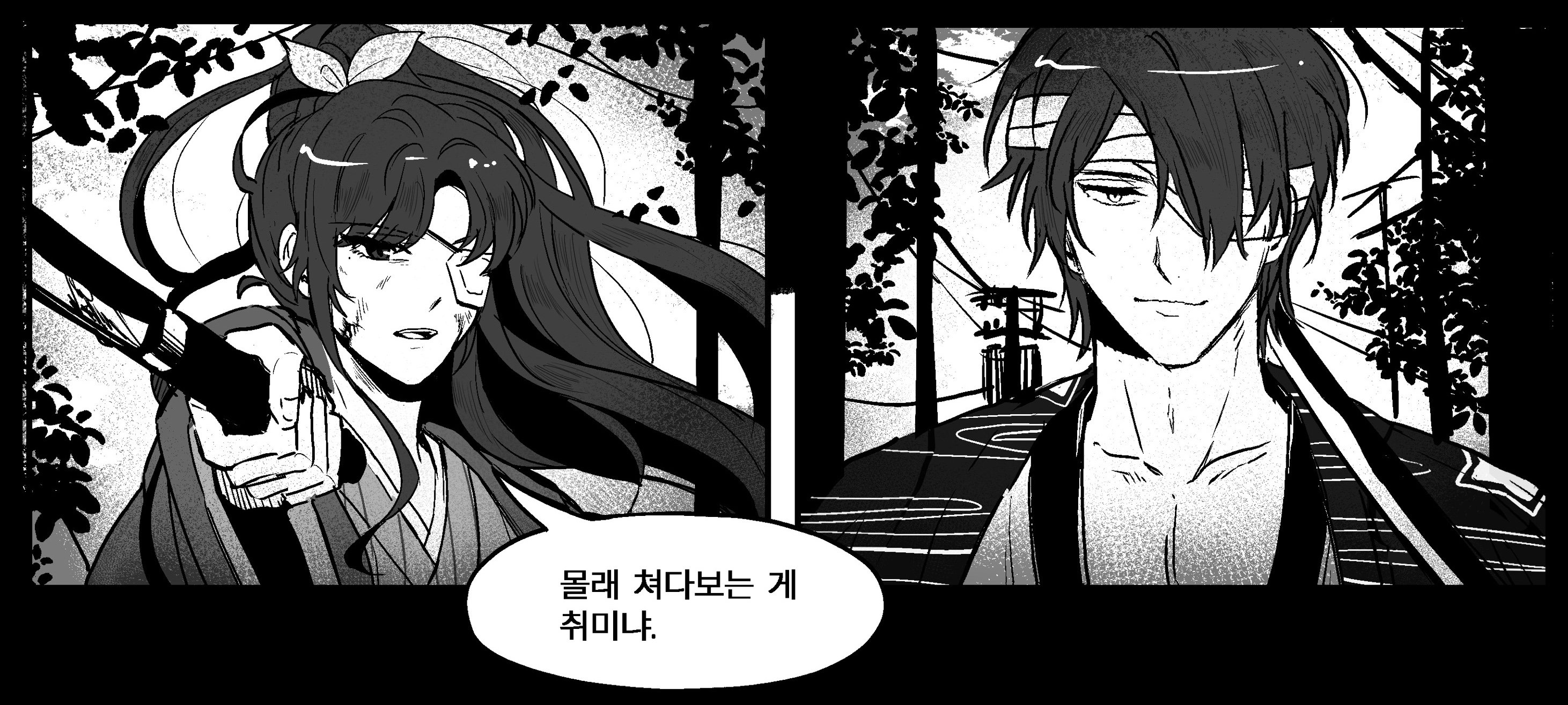 ๊ฐ๋จํ๊ฒ ์๊ฐ๋ฅผ ํ๊ณ ๋จ์ดํธ๋ ธ๋ ๋ ๊ฐ์ ์นผ์ ์นผ์ง์ ๋ฃ์๋ค. ๋งํ์ฝ, ๋ฐ์ฌ์ด, ํ์ผ์น ์์ผ๋ก ํ ๋ช ์ฉ ์์ ๋ง์ก์ผ๋ฉฐ ์ธ์ฌ๋ฅผ ํ ํ ๋จผ์ ์๋ฆฌ๋ฅผ ๋จ๊ฒ ๋ค๋ฉฐ ์ฌ๋ผ์ก๋ค.