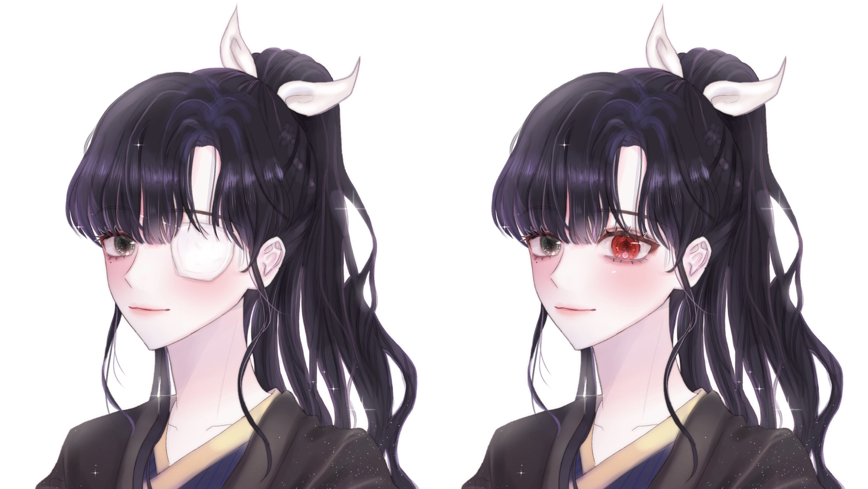 ๋ฐฑ์ฅ ๊ฐ์ ํ์ ํผ๋ถ์ด๋ฉฐ ๋จธ๋ฆฌ์นผ์ ์ด๋์ด ๋ณด๋ผ์์ด๋ค. ํ์์ธ ์ค๋ฅธ์ชฝ ๋๋์, ๋ถ์์์ธ ์ผ์ชฝ ๋๋์๋ฅผ ๊ฐ์ง ์ค๋ ์์ด๋ฉฐ ์ค๋ฅธ์ชฝ ๋ ๋ฐ์๋ ์ ์ด ์๋ค. ์๋จธ๋ฆฌ๋ 6:4 ๊ฐ๋ฅด๋ง, ๋จธ๋ฆฌ์นด๋ฝ ๊ธธ์ด๋ ํ๋ฆฌ๊น์ง ๋ด๋ ค์ค๋ ๊ธด ์ฅ๋ฐ์ด๋ฉฐ ๋จธ๋ฆฌ์นด๋ฝ์ ๋๊ฒ ๋ฌถ๋๋ค. ์๋จธ๋ฆฌ๊ฐ ์ด์ง ํ์ด๋์์๋ค.